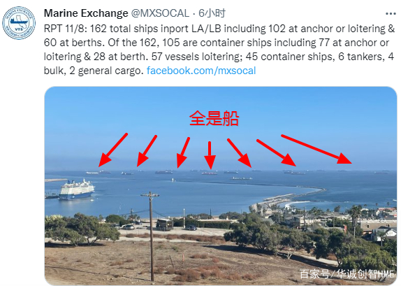 根据最新消息,11月8日,洛杉矶港、长滩港外共有102艘船在等待靠泊,还有60艘已经停靠在了泊位,所以一共有162艘船。尽管联邦政府试图进行干预,清理美国主要门户码头的积压,但船只仍在不断增加。