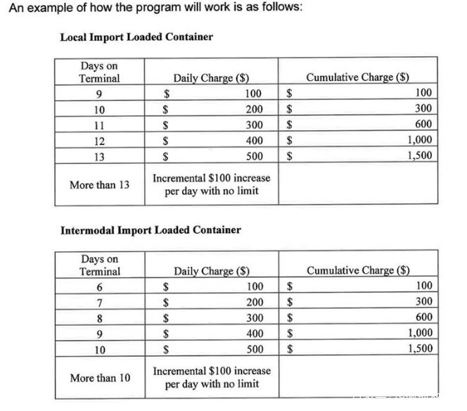 港口方面将从11月1日开始集装箱停留计算时间,从11月15日开始进行收费核算工作。请注意,这里的罚款并不是每一天每个柜交100美元,而是每一天增加100美元,滞留5天累计1500美金,而在极端情况下,滞留一个月的柜子需要缴纳46500美元的天价罚款!