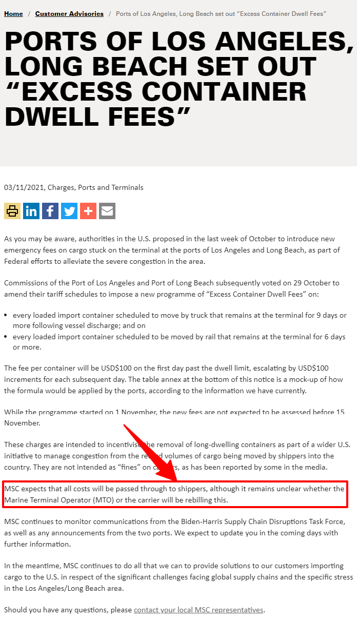 关于超期滞留费,MSC船公司已经放话他们不交,预计所有费用都将转嫁给托运人。