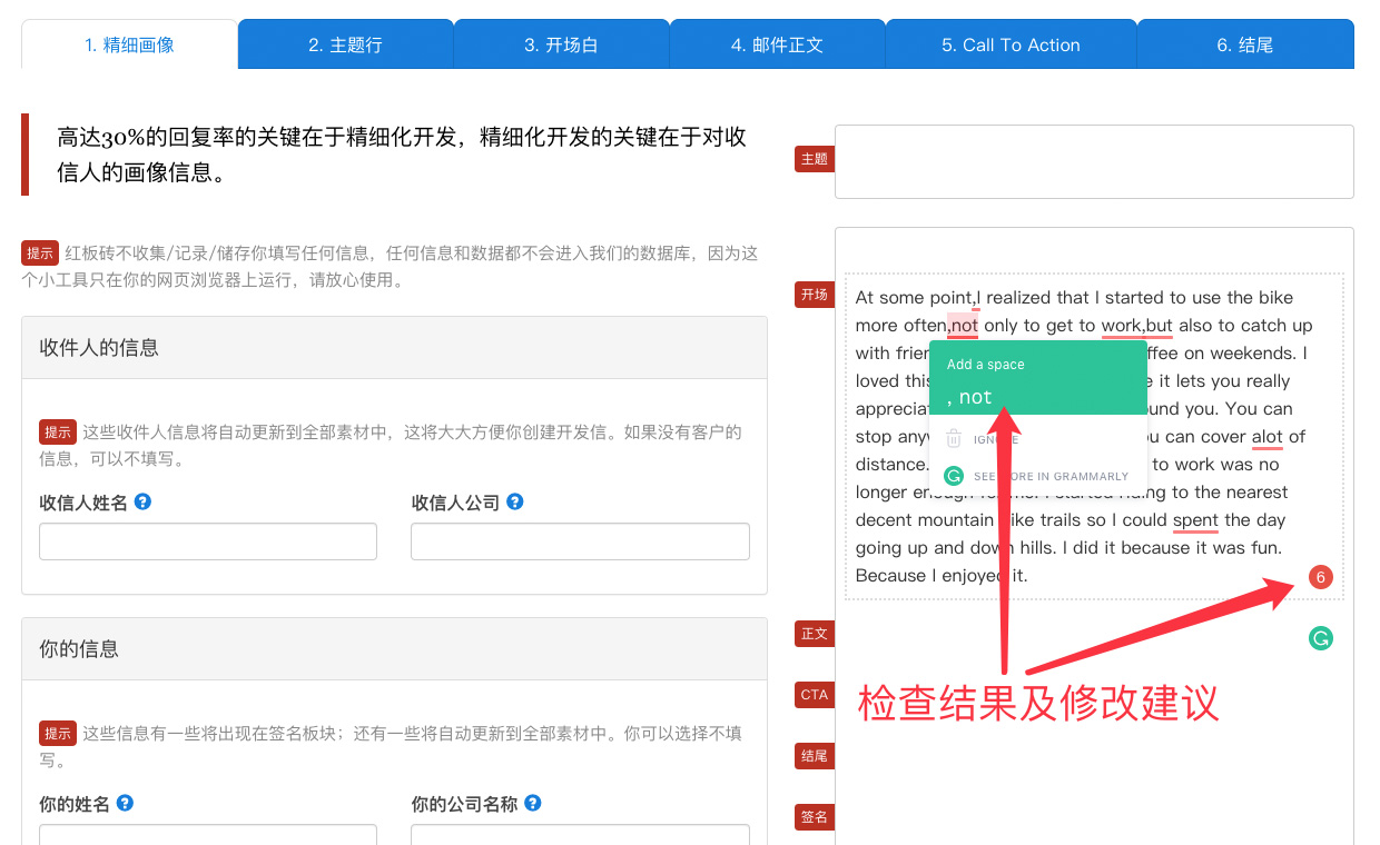 同样,如下图所示,Grammarly插件会自动检查邮件内容,然后告诉你有几处错误,你只要把光标移到划红线的地方,Grammarly就会给你修改意见,点击即可自动修改。