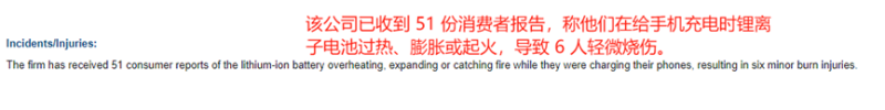 CPSC透露的数据显示,截至目前,针对这款问题产品,Casely公司已收到51份消费者报告,称他们在使用充电宝给手机充电时锂离子电池过热、膨胀甚至起火,已有6位用户因此轻微烧伤。