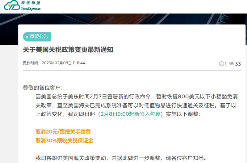 T86政策的变动历程可谓一波三折。早在2025年2月初,特朗普签署行政命令,宣布取消800美元关税豁免政策(即T86政策),这一消息犹如晴天霹雳,让跨境电商行业瞬间陷入紧张与不安之中。然而,仅仅三天后,特朗普政府又宣布行政令推迟,T86政策暂时恢复,随后云途、燕文等物流公司也相继取消了对小额包裹直邮产品的涨价,这无疑给跨境电商卖家们带来了一丝喘息的机会。