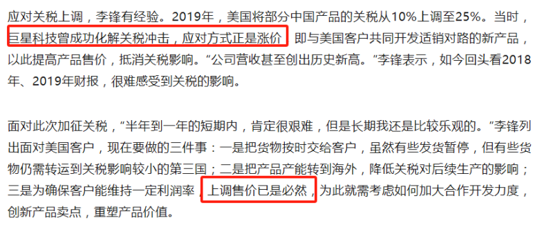 就拿美国对华关税这件事来说,许多跨境大卖做出的选择便是“涨价”,巨星科技是其中一个典型案例。早在2019年美国发起的关税战中,巨星科技就以涨价硬刚,这一次巨星科技同样表示要通过涨价来消化影响。