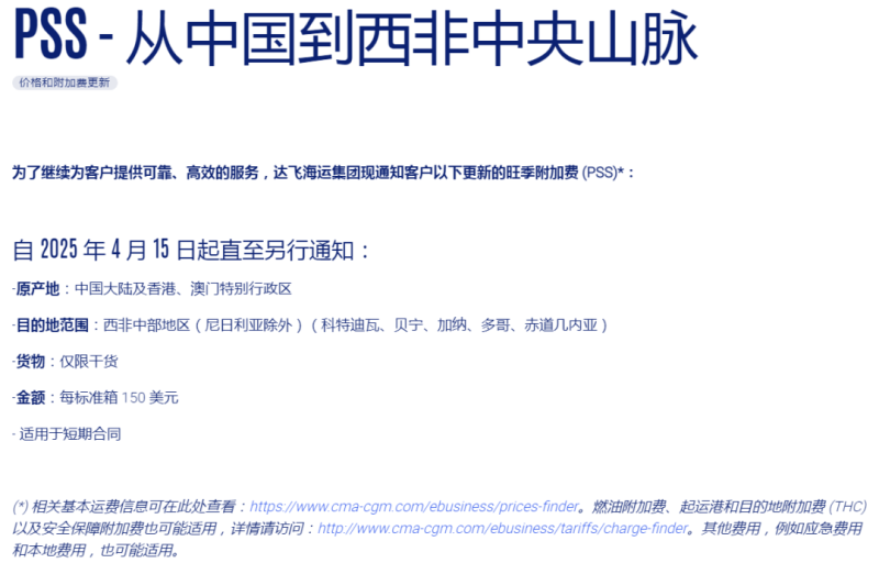 达飞轮船在更早之前就已经率先出手,宣布自4月15日起,对中国和中国香港、澳门特别行政区至西非中部(尼日利亚除外)的干货货物征收150美元/TEU的旺季附加费。马士基不甘落后,自5月15日起,调整从远东亚洲(不包括中国、中国香港)到美国和加拿大的旺季附加费,20英尺集装箱征收1000美金,40英尺和45英尺集装箱征收2000美金。