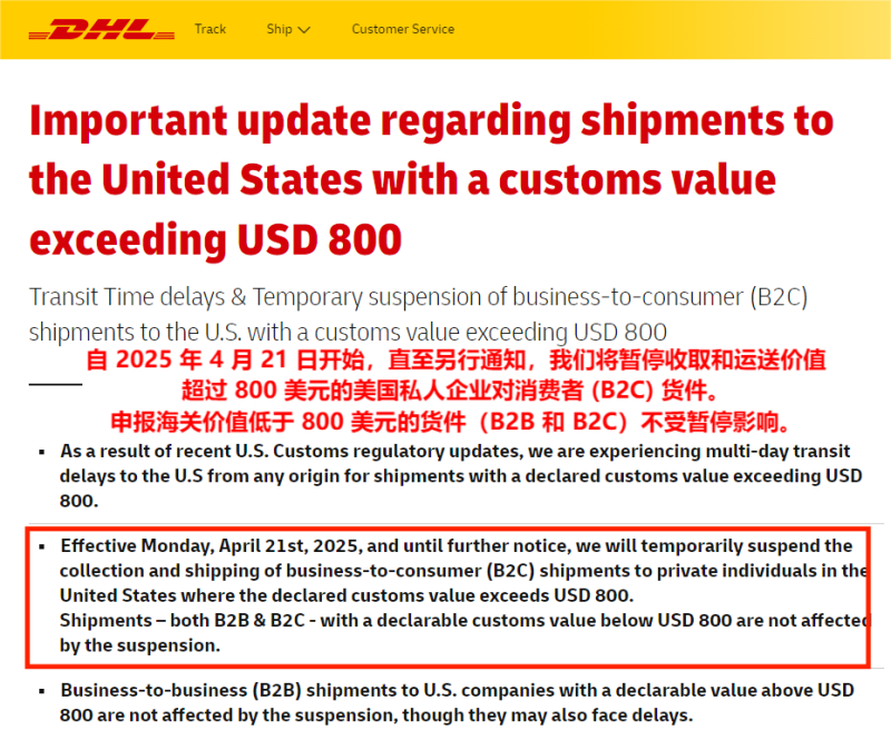 DHL暂停寄送美国800美元以上B2C货件 图源:DHL