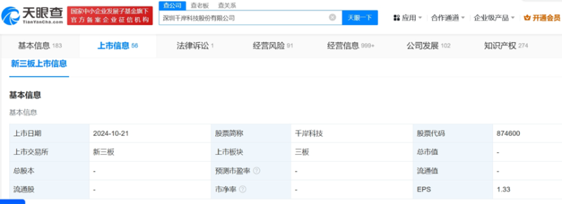 千岸科技上市图源:天眼查