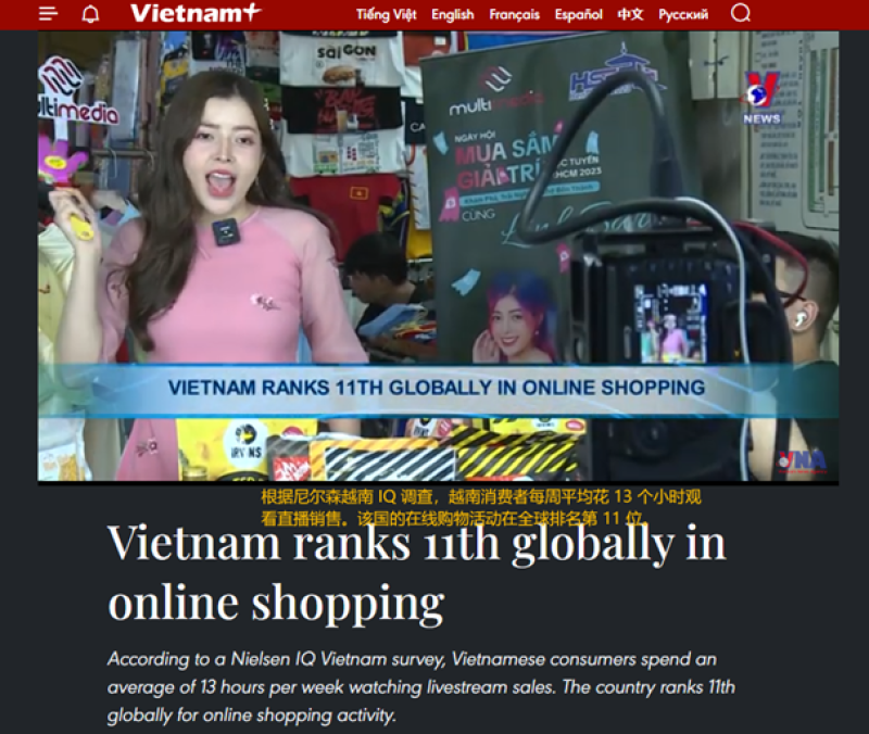 事实也正是如此,根据Nielsen IQ Vietnam的调查,越南消费者每周平均花费多达13个小时观看直播销售,这推动了越南电商市场的发展,目前越南消费者网上购物排名跻身全球第11位。