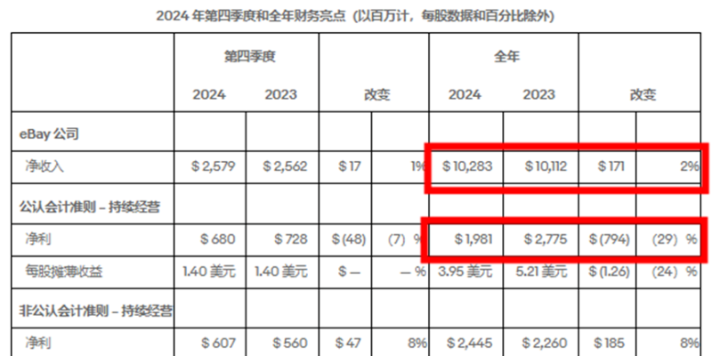从2024年全年来看,eBay营收同比增长2%至103亿美元;GMV同比增长2%至747亿美元。不过净利润同比下降29%至19.8亿美元,盈利能力相比营收能力稍有不足。