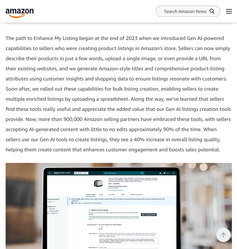 长期以来,亚马逊一直致力于通过AI提升第三方卖家的运营效率。自2023年秋季起,该平台已开始使用AI增强商品详情,并持续推出多项基于AI的卖家工具,包括自动生成产品视频、个性化推荐以及描述优化等。