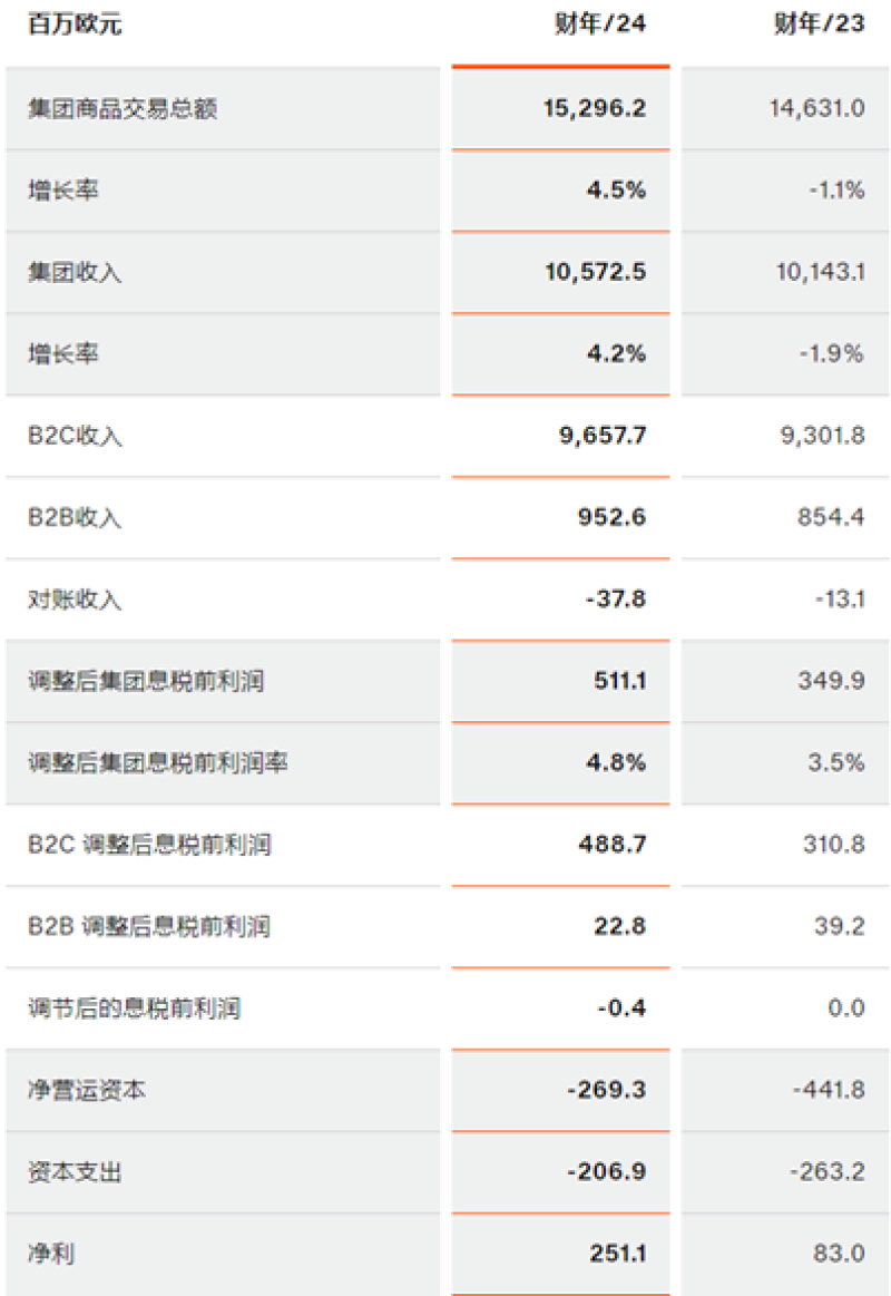 多年的深耕让Zalando收获了可喜的成绩,根据Zalando发布的2024年财报,该公司全年GMV达到约152.96亿欧元,同比增长4.5%;实现营收105.72亿欧元,同比增长4.2%;净利润同比大涨200%,为2.51亿欧元。