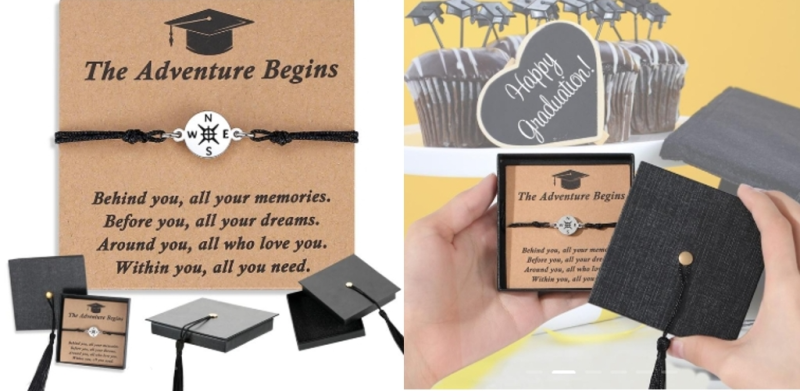 从手链的外观上来看,中间吊坠的形象就像一个指南针,标注了“东南西北”四个方向,寓意是希望佩戴者毕业后能找到自己的人生方向。此外,该产品的包装盒也不是普通的,而是有设计感的,它被设计成一个学士帽的造型,很好契合了当下毕业生的状态。