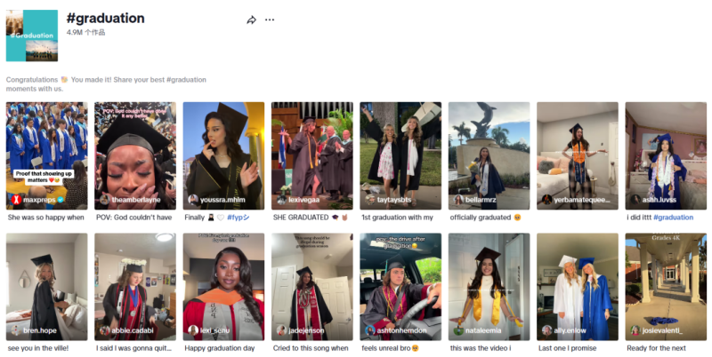 大家都知道,美国人相当注重生活的仪式感,无论是什么节日、纪念日,他们都愿意花时间准备、庆祝,毕业自然也不例外。据数据显示,目前在TikTok上搜索上#graduation(毕业)话题,可以发现已经有接近500万条视频,并且播放量也十分惊人,已突破500亿次大关。