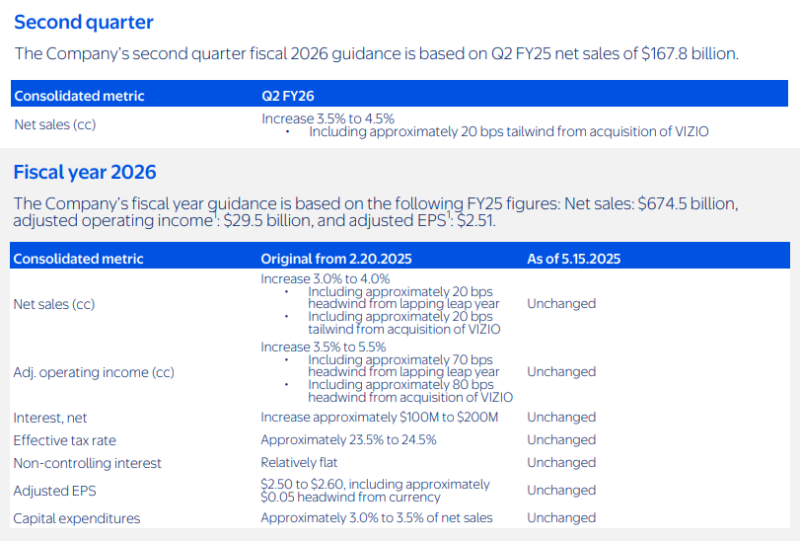 展望未来,沃尔玛维持了全年预测,即本财年销售额增长3%至4%,调整后每股收益为2.5美元至2.6美元。预计第二季度销售额将增长3.5%至4.5%,但由于美国关税政策波动,沃尔玛没有提供每股收益或营业收入增长预期。