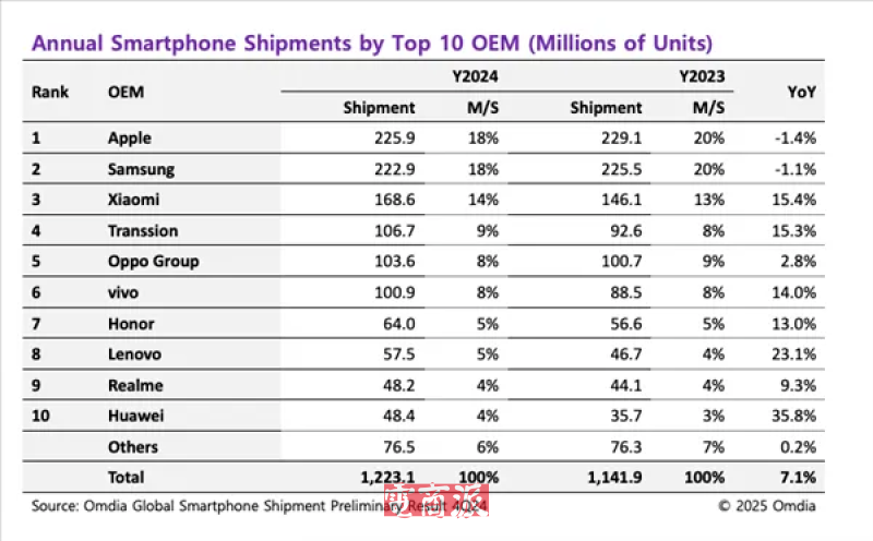 根据市场调研机构Omdia的报告显示,2024年全球智能手机市场呈现出复苏态势,全年总出货量攀升至12.23亿部,较2023年增长了7.1%,而在这些玩家中,表现最亮眼的国产品牌则是小米。