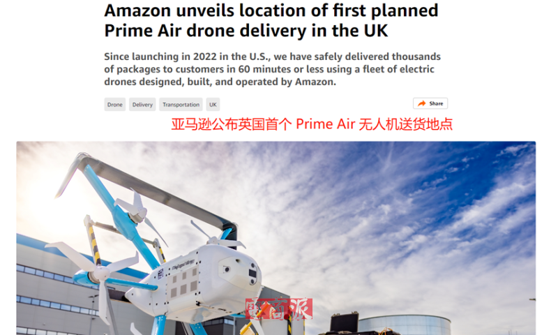亚马逊宣布在英国推出无人机送货服务 图源:亚马逊