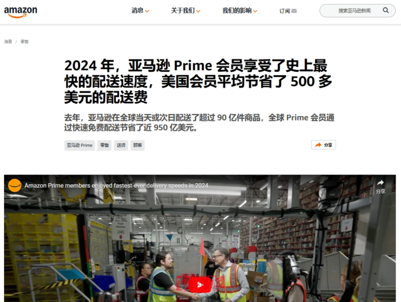 功夫不负有心人,亚马逊在物流建设方面所付出的心血最终让它自己收获了满满硕果。根据亚马逊发布的数据,亚马逊的配送速度在2024这一年得到了质的飞跃:亚马逊在全球当日或次日送达了超过90亿件商品,全球Prime会员通过快速免费配送节省了大约950亿美元。