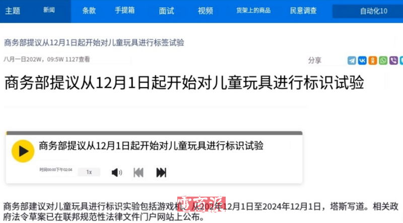 实际上在很早之前,俄罗斯就关注到了这一情况,并以儿童玩具产品领域为切入点出手整治。俄罗斯联邦工业和贸易部发布文件表示,“我们将于2023年12月1日至2024年12月1日,在俄罗斯开展对某些类型的儿童商品进行标签试验。”