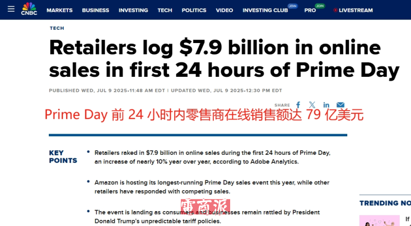 值得注意的是,AdobeAnalytics的数据显示,零售商在PrimeDay的前24小时内实现了79亿美元的在线销售额,同比增长近10%。而亚马逊的Prime Day促销活动也于周二开始,持续至周五,今年也是其举办的持续时间最长的PrimeDay促销活动。