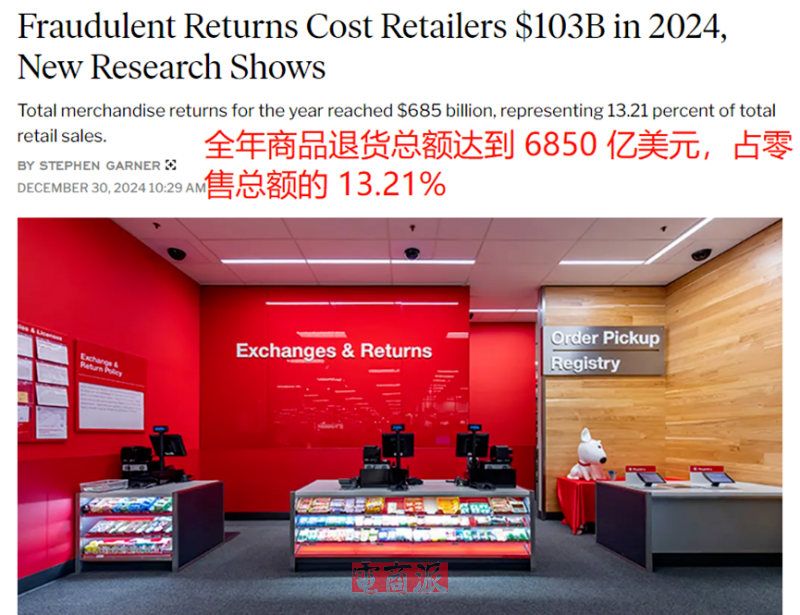 以美国市场为例,Appriss Retail和德勤联合发布的《2024年零售业消费者退货年度报告》显示:2024年美国商品退货总额达到了惊人的6850亿美元,占据总零售额的13.21%。