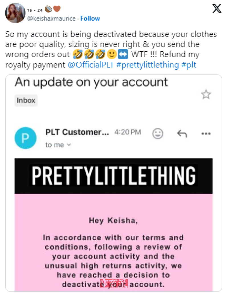 顾客收到账户停用通知 图源:X