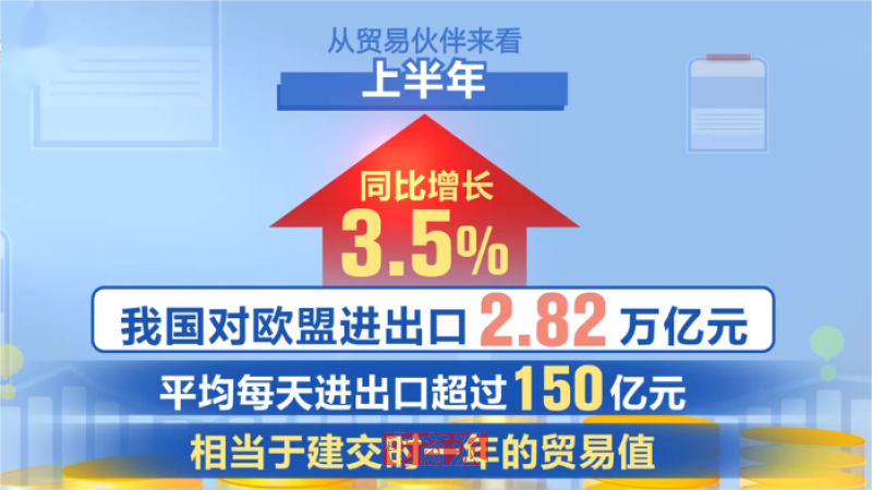 今年上半年,我国对190多个国家和地区进出口实现增长,贸易规模超过500亿元的伙伴数量达61个,同比增加了5个。其中,对欧盟进出口2.82万亿元,同比增长3.5%;对非洲进出口1.18万亿元,增长14.4%,对中亚进出口3572亿元,增长13.8%。