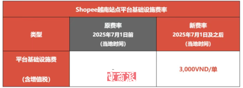 6月,Shopee越南站点也宣布,自2025年7月1日起,Shopee越南站点将新增平台基础设施费用,按照每单3000越南盾的标准收费。