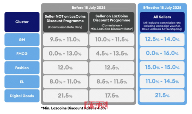 以Lazada为例,在今年3月上调跨境商家佣金费率和金币折扣最低费率后,近期Lazada马来西亚又发布公告,称将在7月18日后调整卖家佣金费率,通用商品、时尚、快消品、电子产品等品类佣金普遍上调2%-5%,其中电子产品应收费率最高,达到21.5%,8%的销售税则保持不变。