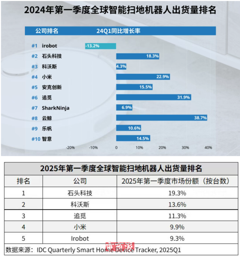 与2024年同期相比,这一市场格局有所变化,但整体上,中国厂商五占四的格局分布没有变化。反而是石头科技、科沃斯、小米、追觅四者排名有所提升,将美国头部品牌Irobot挤至第五席位。