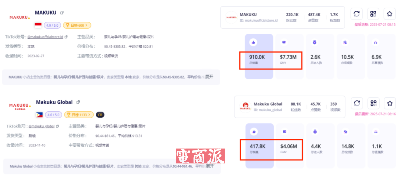 三方平台Echotik数据显示,截至目前,MAKUKU印尼小店总销量超过91万件,累计销售额超773万美元;菲律宾小店(全球店)总销量超41万件,累计销售额超446万美元。