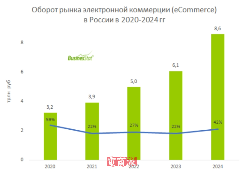 不得不说,俄罗斯电商市场近年来呈现出蓬勃发展的态势。分析公司BusinesStat数据显示,截至2024年底,俄罗斯电商市场支出达8.6万亿卢布,同比增长了42%。