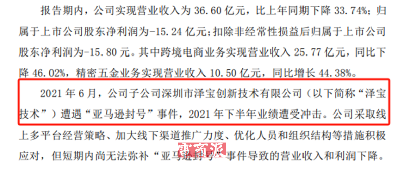 失去了亚马逊这个主要收入来源,泽宝技术业绩暴跌,2021年下半年一度巨亏15亿元。