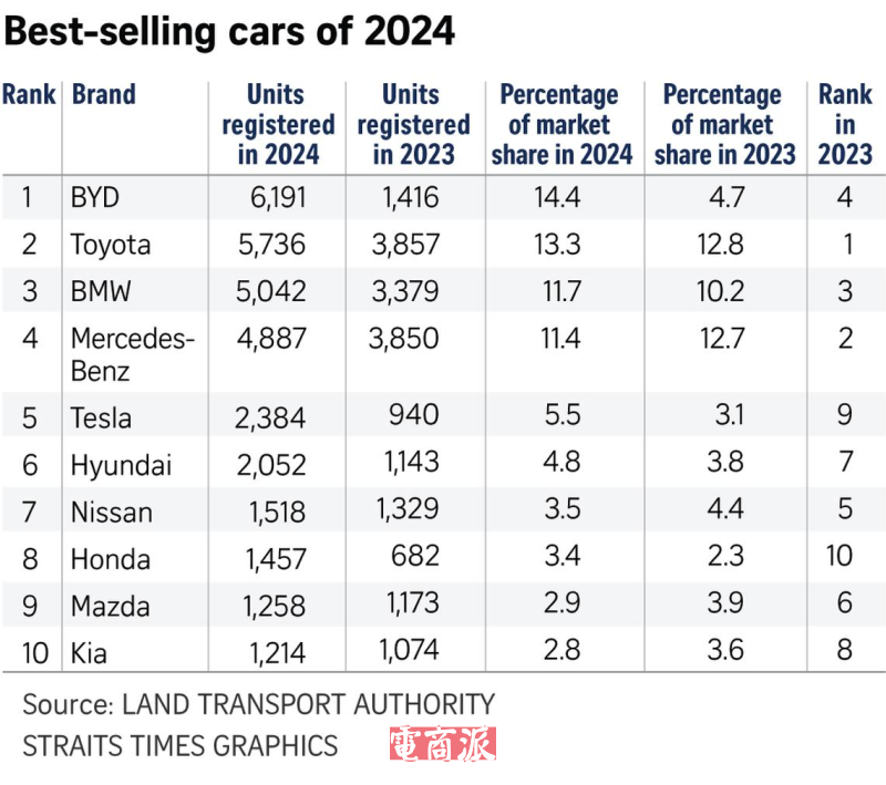 比亚迪拿下2024新加坡新车销量第一 图源:straitstimes