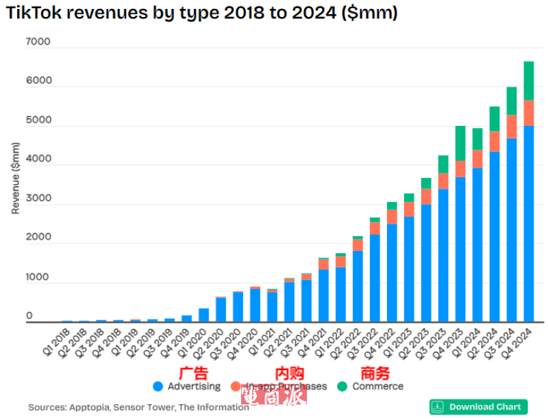 据调查媒体The Information的数据,尽管2024年字节跳动整体净利增速和利润率有所放缓,但以TikTok为核心的海外业务收入仍实现同比增长63%,占总营收比例提升至四分之一,创下历史新高,表明TikTok的商业价值仍有较大的上升空间。