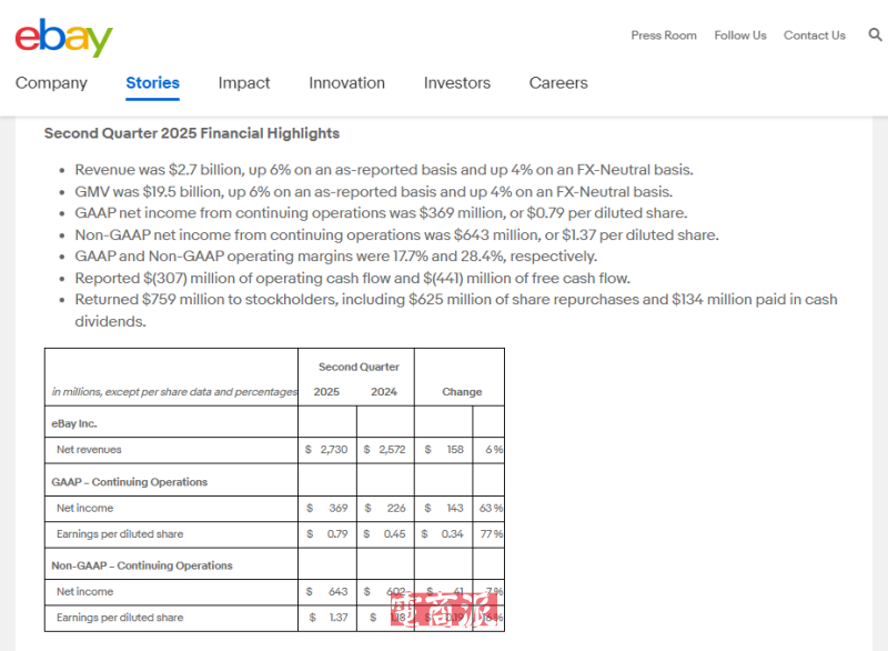 7月31日消息,eBay公布2025年第二季度财务业绩。报告显示,eBay二季度总营收为27亿美元,同比增长6%;商品交易总额(GMV)达195亿美元,同比增长6%;持续经营业务的GAAP净利润为3.69亿美元,GAAP经营利润率为17.7%;Non-GAAP净利润为6.43亿美元,Non-GAAP经营利润率为28.4%。