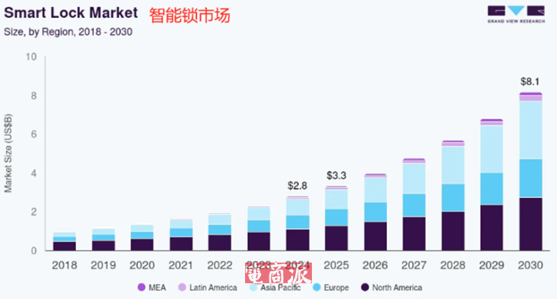 Grand View Research的数据显示,得益于联网家居设备和智能家居技术的日益普及和进步,全球智能门锁市场依然保持高速增长。2024年该市场的总规模达27.7亿美元,预计到2030年,这一数字将增长至81.369亿美元,2025年至2030年的复合年增长率高达19.7%。可见凯迪仕脚下的,是多么宽广的一条赛道。