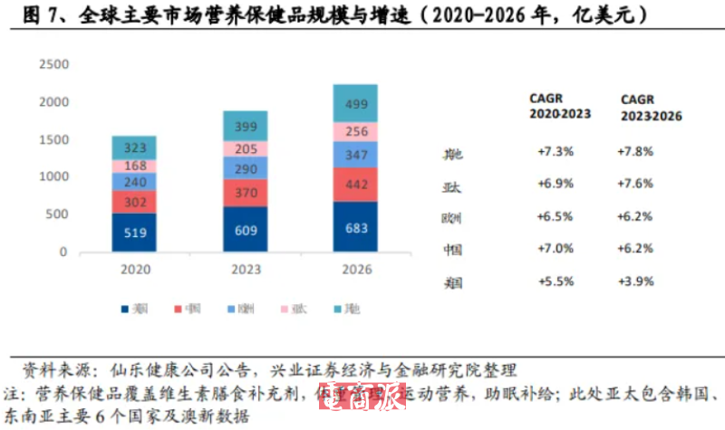 有数据指出,2023年时,全球保健品行业规模就已经达到了惊人的1873亿美元。其中,美国是全球最大的成熟市场,市场份额为32.51%,排名第二的是中国市场,占比19.75%,紧随其后的是欧洲和亚太地区。值得一提的是,这些市场的复合年均增长率在未来几年都将保持较高的水准。