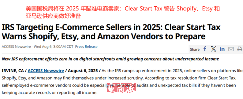 针对美国税务监管政策的变化,税务解决公司Clear Start Tax相关发言人指出:“我们看到美国国税局处理网上收入的方式发生了重大转变,过去被认为是低风险的副业收入,现在成了关注焦点。如果你是一名电商卖家,并且还没有认真对待税务合规问题,那么今年是时候做出改变了。”