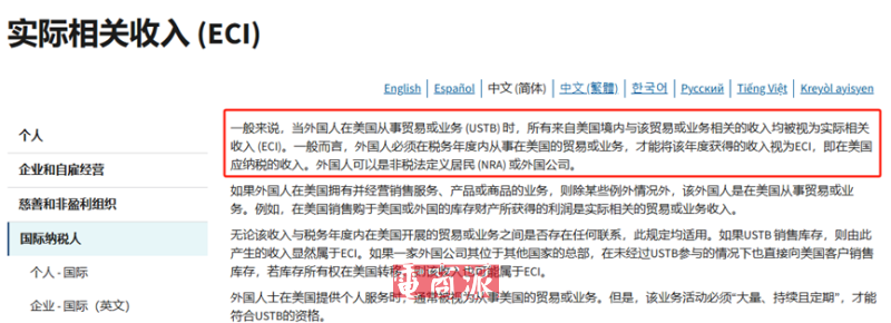 对此,美国国税局IRS进行了更详细的讲解。根据该部门发布的关于海外纳税人Effectively Connected Income (缩写为“ECI”,即“有效关联收入”)的指引,如果使用自己在美国注册的商标或专利来卖货,或者在亚马逊FBA仓库等美国境内仓库中储存商品,就会被认为在美国拥有业务,即使不是美国人,也会被认为产品ECI收入,就必须向美国国税局纳税。