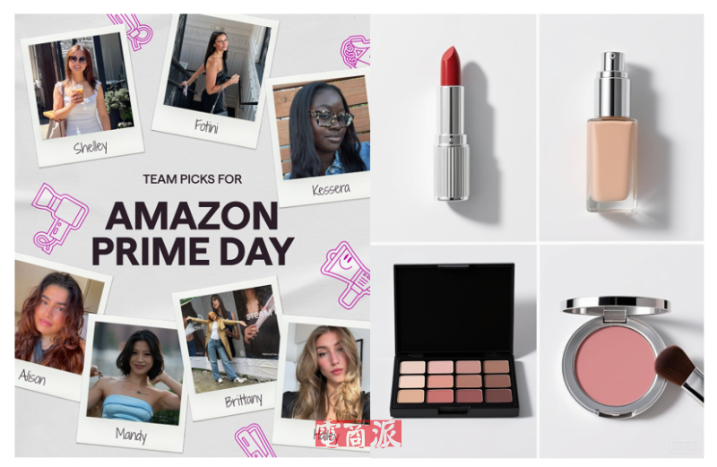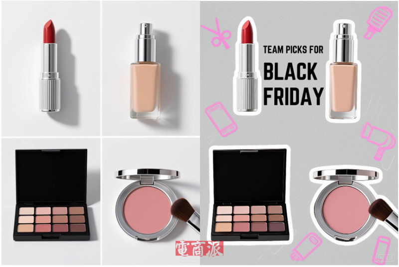 效果还是很不错。原图的风格很像照片墙,中间有醒目的大字提示是亚马逊Prime Day大促。生成的海报很好地还原了这些特征,抠出来的四个美妆产品用了白边修饰,减轻了抠图的孤立感,同时字体模仿也很到位,突出“BLACK FRIDAY”这个核心主题,再用小字补充“TEAM PICKS FOR”(团队严选),彰显产品的独特性。