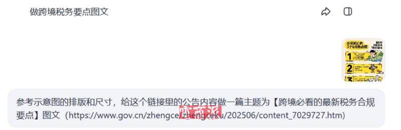 接着,再试试生成社媒图文,这个功能可延伸的内容比较多,可以做小红书图文、微信排版文章等。这里就分别做一篇跨境税务新政相关的小红书图文和公众号文章。