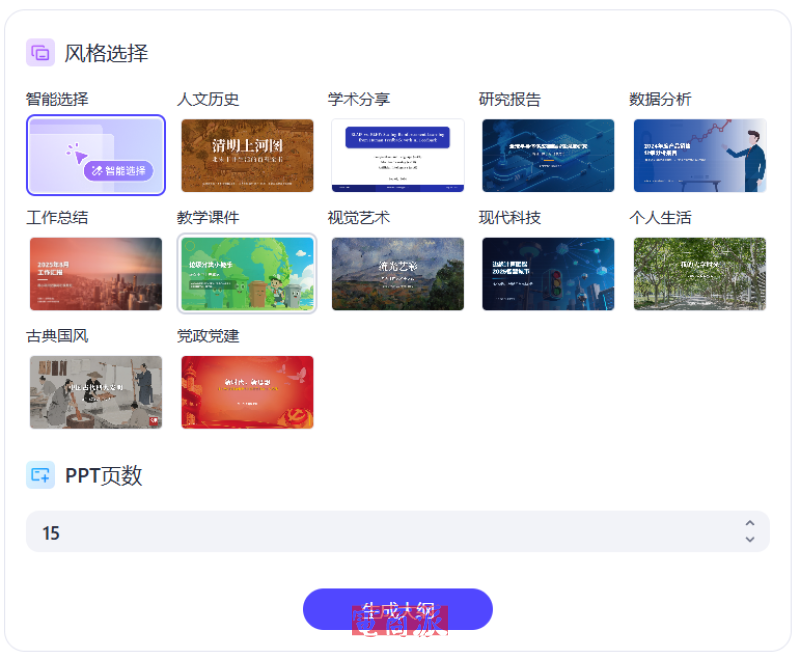 这中间,有一点值得注意。系统生成PPT时,会提供自主选择,可以自己挑选PPT模板,调整PPT内容布局,自定义功能比较完善,感觉可以适用于大多数PPT汇报的场合。
