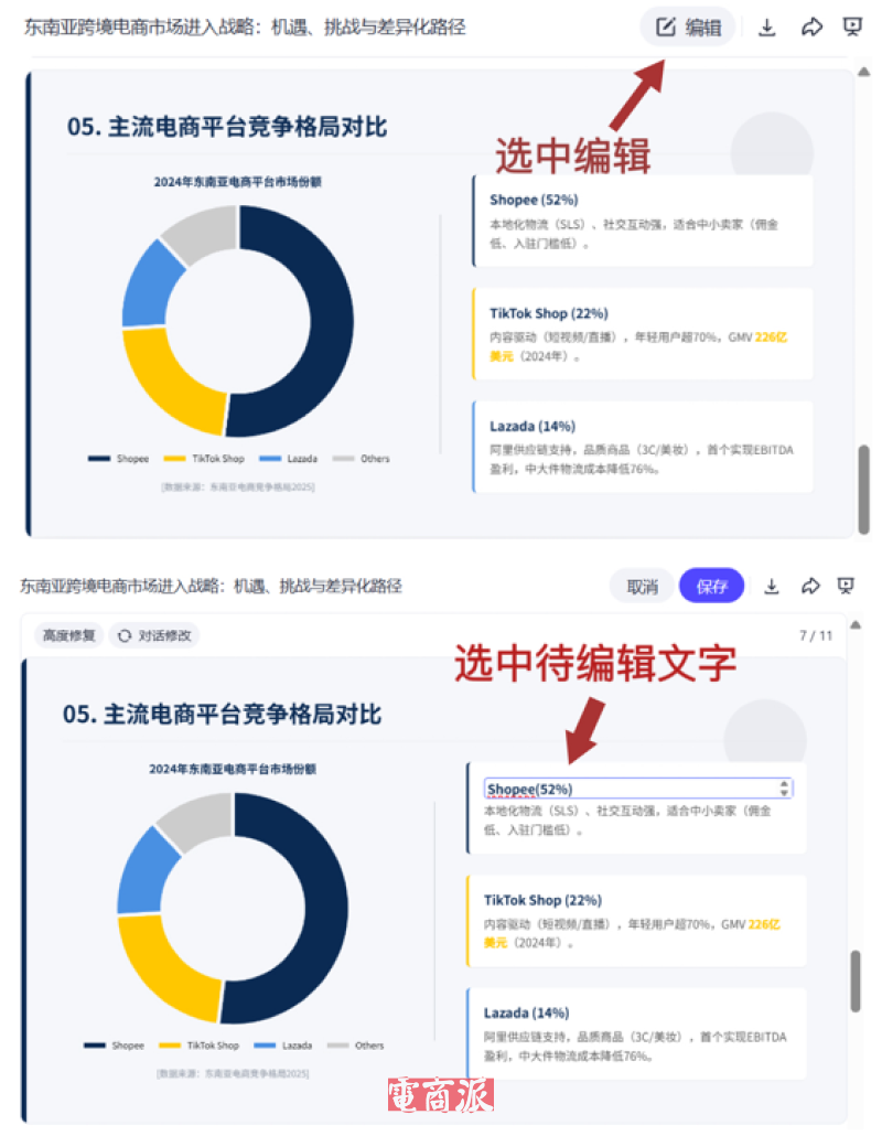 这里就试着做了一份关于跨境电商东南亚市场战略的汇报PPT,没有给具体内容,直接让扣子空间现搜。看一下结果,总共十页的PPT,八个主题,分析了东南亚市场规模、进口政策、消费者网购行为、电商平台竞争格局等,内容完整风格合适,完全可以直接拿去展示。