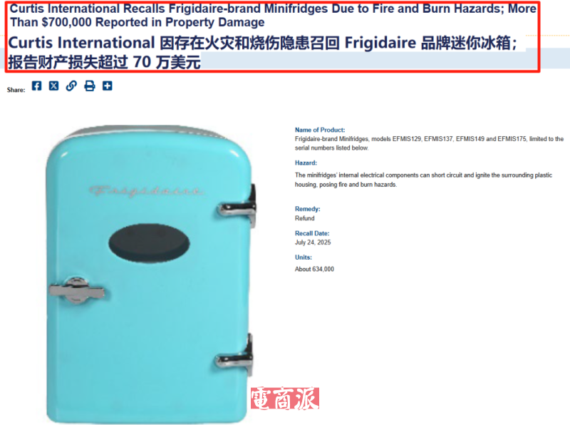 无独有偶,另一项同样严重的产品安全问题浮出水面,柯蒂斯国际公司进口并贴牌Frigidaire 的特定型号迷你冰箱被紧急召回,涉及 EFMIS129、EFMIS137、EFMIS149、EFMIS175 等型号,召回总量高达634,000台。至于召回原因,是其内部电气元件存在致命缺陷,可能短路并引燃周围塑料部件,给用户带来严重的火灾和烧伤风险。
