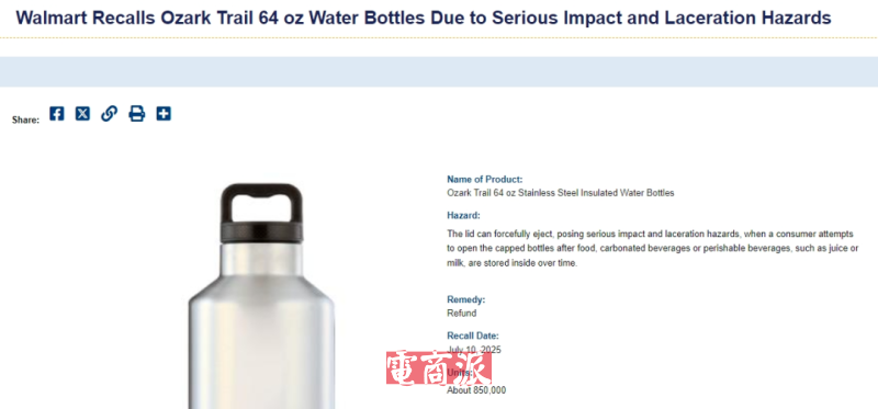 7月初,沃尔玛联合CPSC发布了一篇召回公告,召回Ozark Trail 64盎司不锈钢保温水瓶(型号83-662),召回数量达到85万件。原因是产品在设计上的缺陷,瓶盖与瓶身密封性过强,缺乏压力释放机制等。