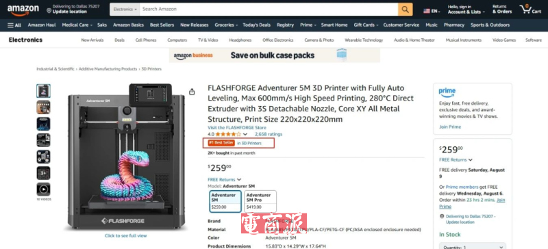 再比如来自浙江的闪铸科技,成立于2012年,产品线覆盖消费级、商业级、工业级全场景。去年下半年,闪铸科技一款消费级新品Adventurer 5M打印机,一经上线便坐上亚马逊同类目BS榜第一,此后更是连续12个月蝉联亚马逊美站3D打印机销量冠军。