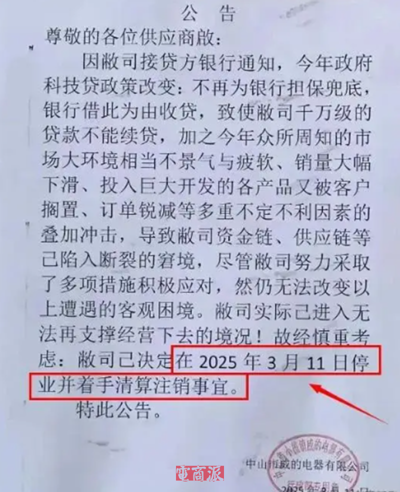 比方说,今年3月,中山市威的电器有限公司就流出一则停业公告,引发广泛热议。在公告中,威的电器表示,由于银行信贷政策调整,加上大环境不景气,导致公司代工订单锐减,收入大幅下滑,最终资金链、供应链都陷入断裂的困境,不得不决定停业并准备清算注销事宜。