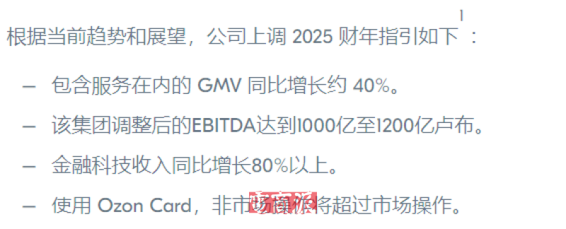 目前,针对2025年业绩,Ozon已经做出了乐观指引,预计总GMV同比增长约40%;调整后EBITDA达到1000亿-1200亿卢布;金融科技收入同比增长80%以上。净利润方面,由于一季度处于亏损状态,Ozon没有透露具体预期。