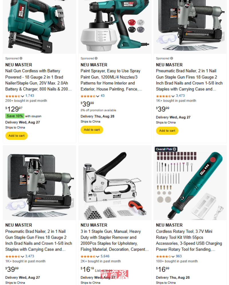 普莱得的产品矩阵十分丰富,拥有热风枪、电动钉枪、螺杆切割机、电钻、清洗刷等近400种规格型号,可以应用的场景也十分广泛,在欧美、亚太等全球百余个国家和地区都十分畅销。在亚马逊平台上,普莱得自有品牌NEU MASTER销量表现也十分不错,已成为亚马逊细分类目BS榜的常客。