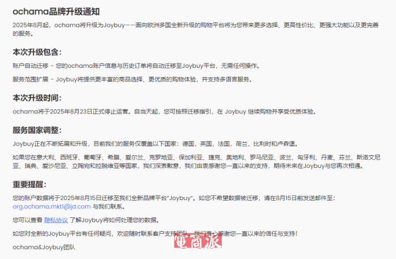 此外,升级后,服务范围大幅缩小,除了Joybuy已进入的市场,德国,英国,法国,荷兰,比利时和卢森堡,ochama其余国家业务将全部暂停,直到Joybuy也进入这些市场。