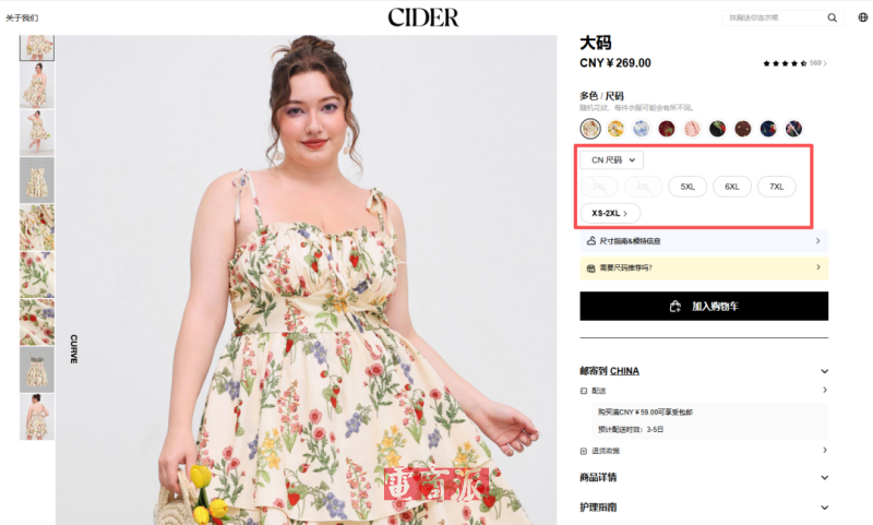 另外在尺码包容性方面,Cider也走了一条与其他快时尚品牌不同的道路:为了照顾到更多不同身材的消费者,Cider提供从 XXS 到 4XL 的宽泛尺码选择,拒绝让身材焦虑成为女性追求时尚的阻碍,这不仅体现了品牌的人文关怀,也使其受众群体得到了极大的拓展。